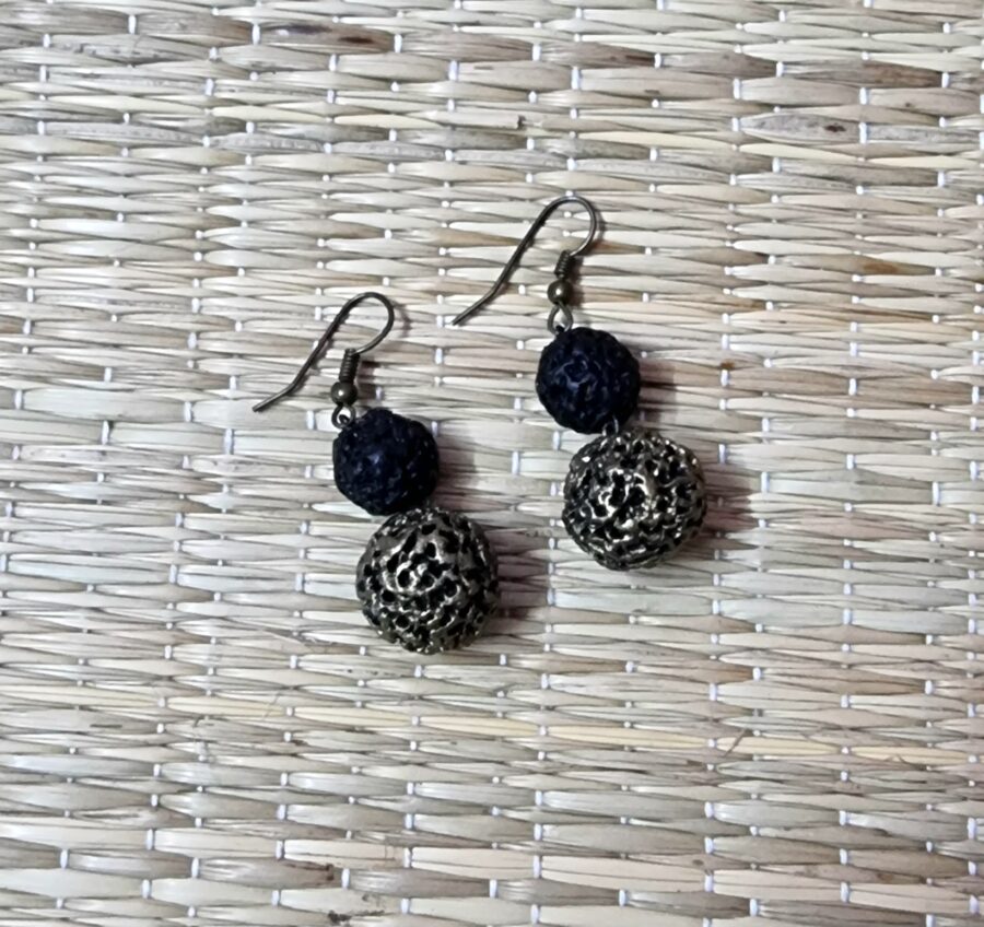 “Dvisha” earrings feature a duo of black and antique gold rudraksha beads, giving a bold yet elegant ethnic touch. Lightweight and versatile, they pair beautifully with festive outfits and traditional wear.